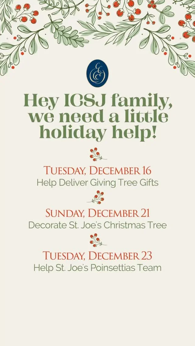 Help us bring the Christmas spirit to ICSJ! Join us right after the 11 AM Mass to decorate St. Joe’s Christmas trees. It’s a fun, festive way to serve, meet others, and make our worship space shine for the season.