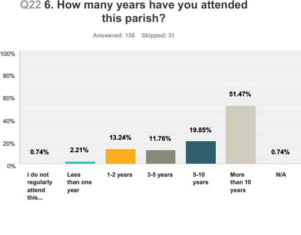 - Over 80% of survey respondents believe that the preaching in the parish inspires him or her to actively live out their faith and that the music at mass enriches their worship.